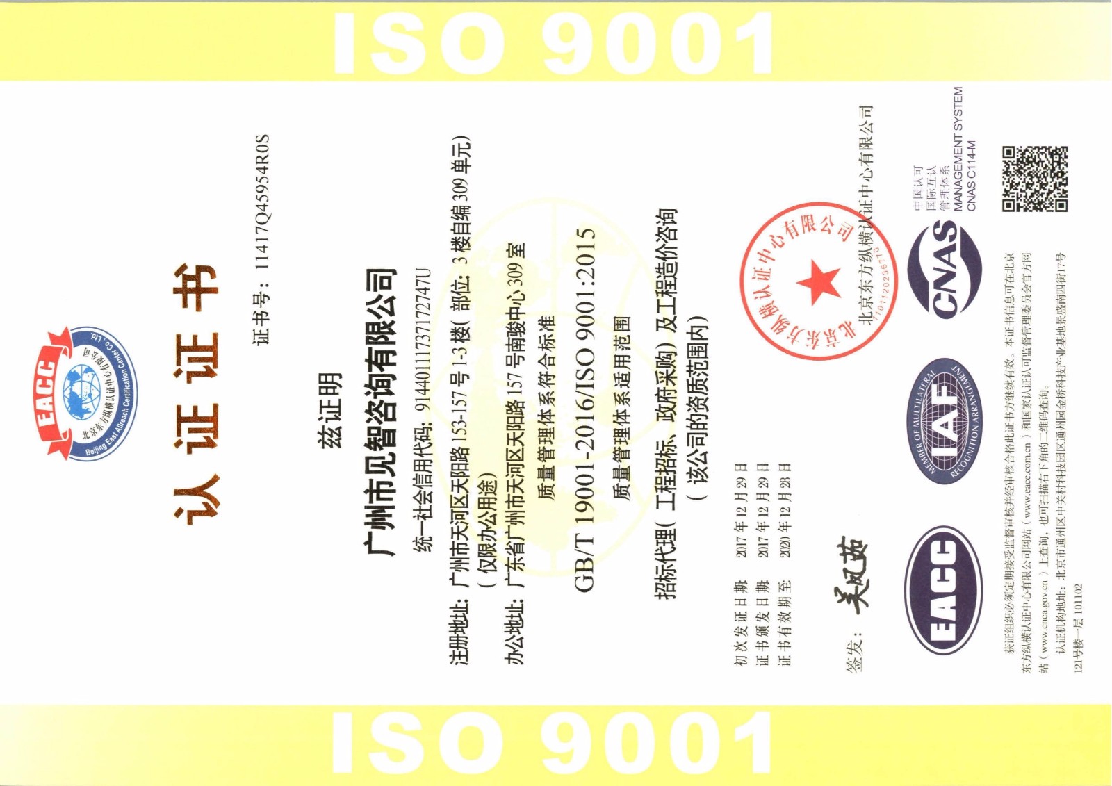 近日,廣州市見智咨詢有限公司順利通過質(zhì)量管理體系認(rèn)證審查,針對我司所從事的招標(biāo)代理(工程招標(biāo)、政府采購)及工程造價咨詢進行了審核,在公司全體員工的共同努力下,我司以完善的管理體系和嚴(yán)謹(jǐn)?shù)姆?wù)措施順利通過了GB/T 19001-2016  /ISO 9001:2015質(zhì)量管理體系認(rèn)證,并榮獲EACC(北京東方縱橫認(rèn)證中心有限公司)頒發(fā)的證書。